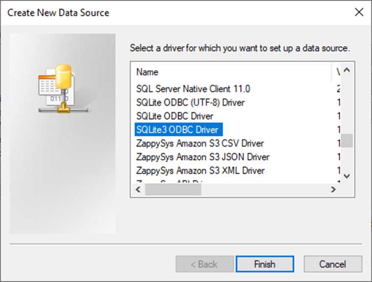 - Select SQLite3 ODBC Driver from the list and click Finish.