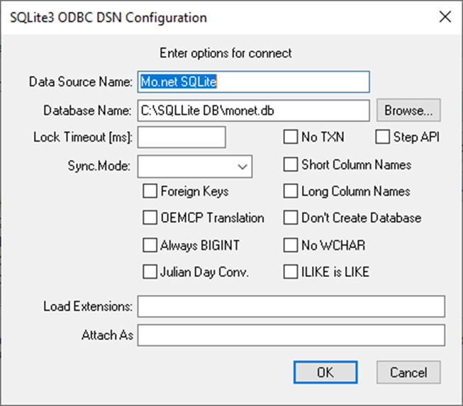 - Give the data source a name – e.g. Mo.net SQLite – and browse to the SQLite .db file containing your data – in this case monet.db. Click OK to create the data source.