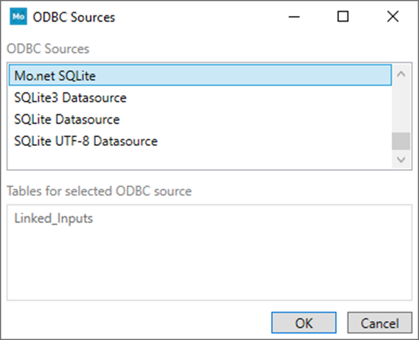 - Click the Source property and then scroll down and select the Mo.net SQLite connection created above. This should list the tables of data available – such as the Linked_Inputs imported for this example.