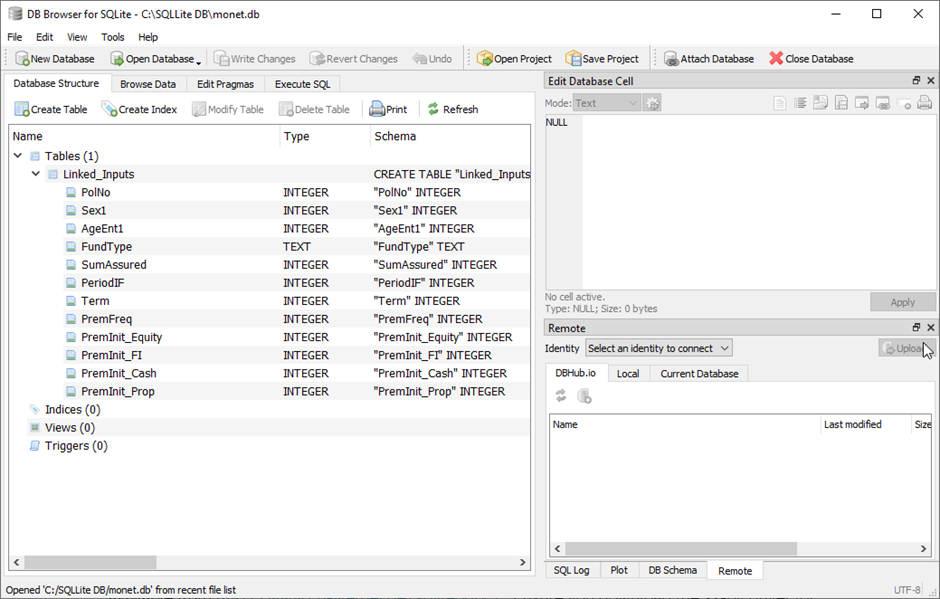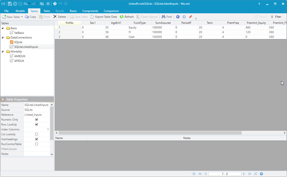For this example I have loaded the Linked_Inputs.txt inputs file from the LinkedFundsDynamic sample project into a SQLite database called monet.